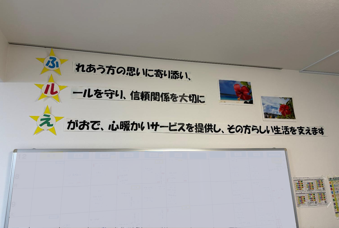 事務所の一室に飾られている帝人訪問看護ステーション古江のスローガン。"ふるえ"にちなんだユニークなアイディアになっています。